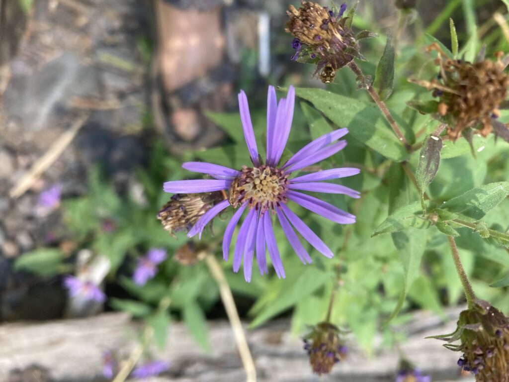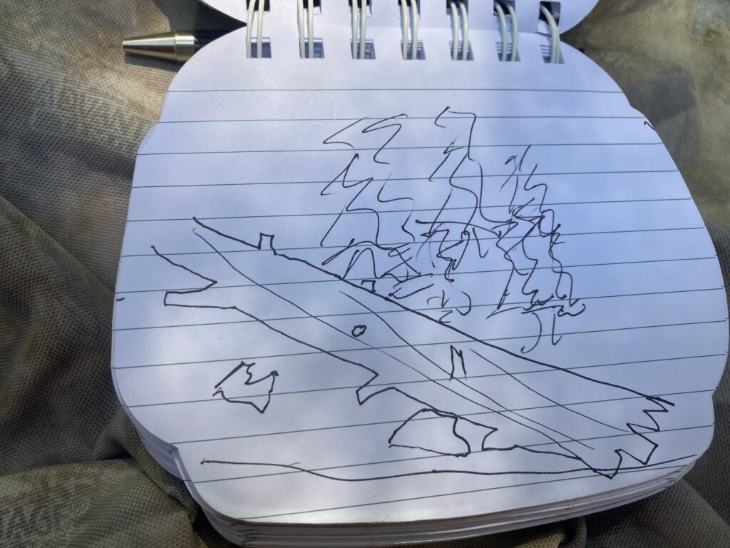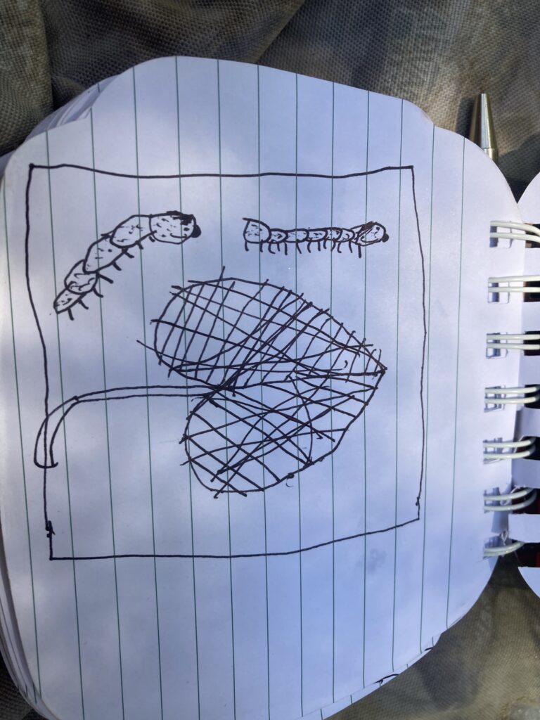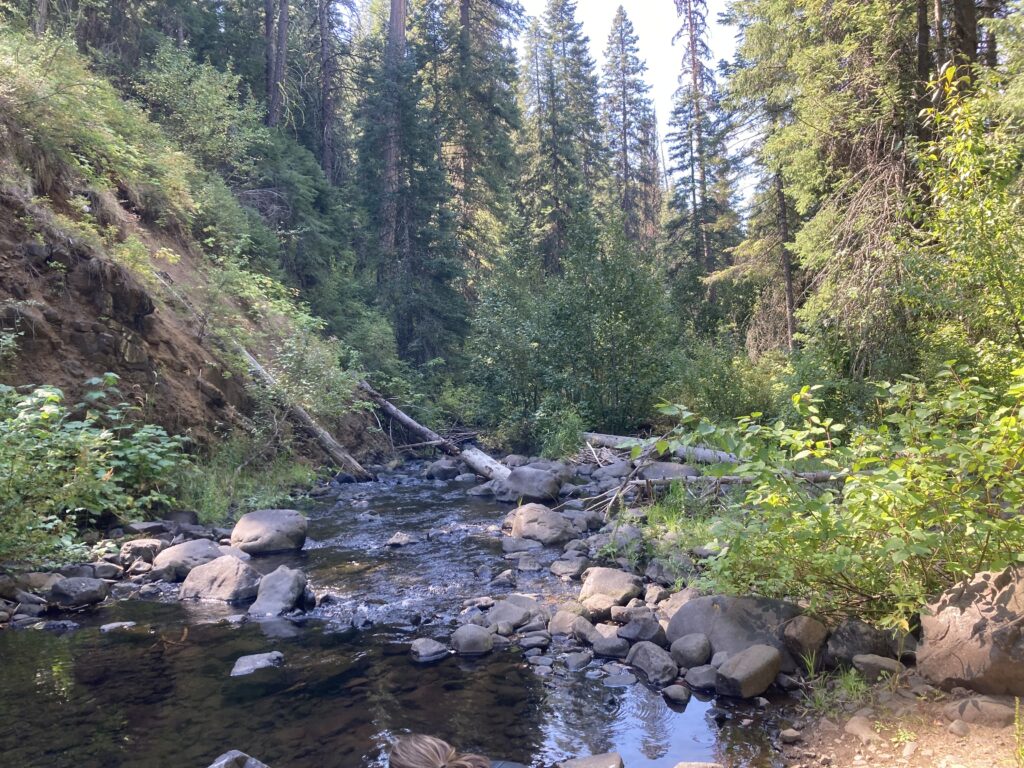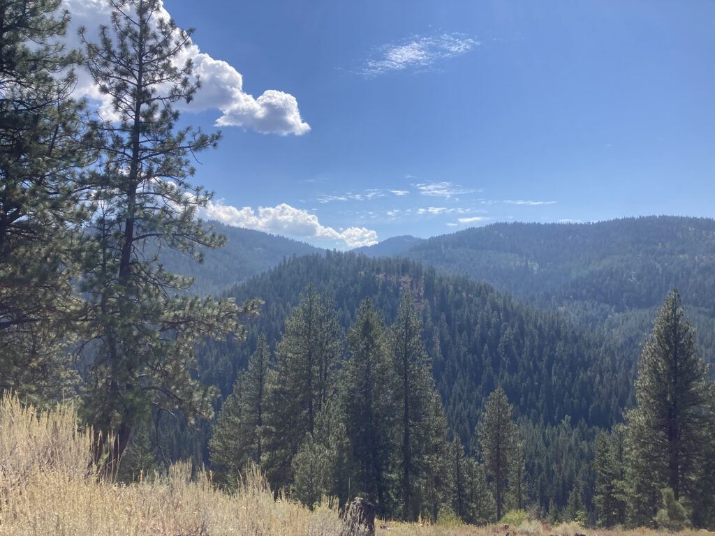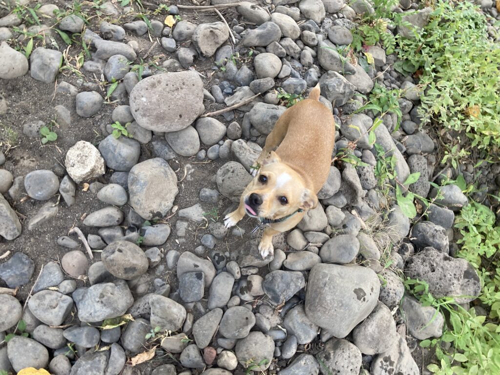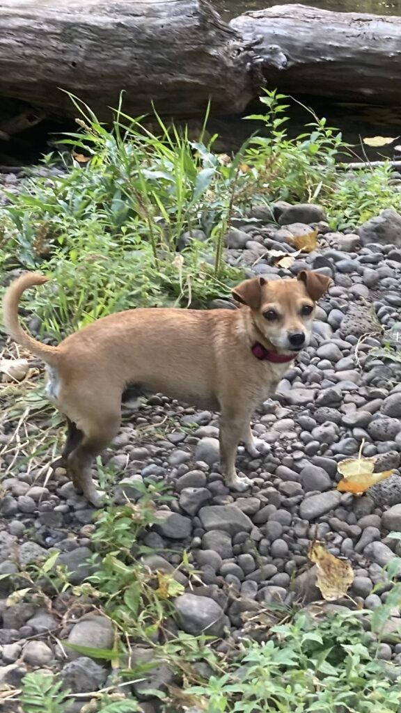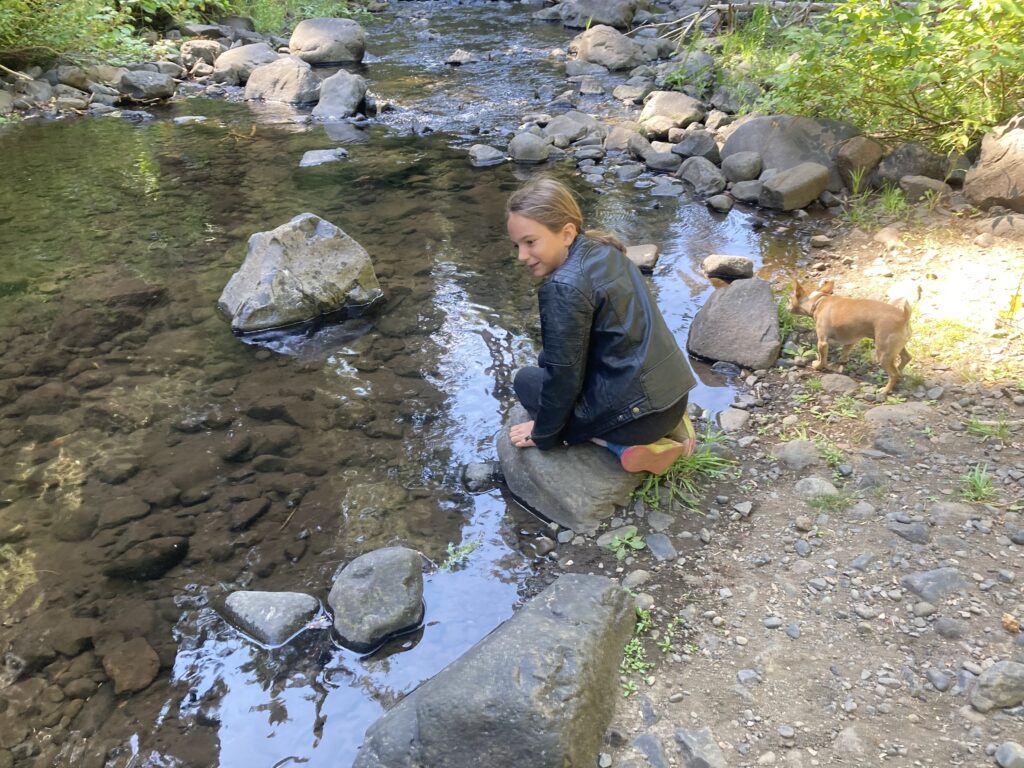 After visiting we headed up the mountain. It was a beautiful day and the weather was perfect. We rode a few miles before I turned off on a side road. It was a really rough road and we slowly went up it a ways. Then we stopped to take a break and let the dogs run around. We discussed going up further but decided to go back down and stop by the river. The road was full of lots of big sharp rocks and I didn’t want to get a flat tire. We drove down and found a nice spot by the river to hang out and do school. We were doing art today and I had Angel find things in nature to draw. She wanted me to draw too and we took turns using the pencil and paper. While Angel was drawing, I found some thimble berries that were still ripe. They sure are tasty. The dogs had a great time running around. Tiny-boy is really enjoying his life with us. Little Bit and him are best friends and he’s super easy to train.