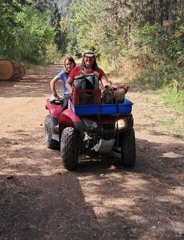 When I got home, Angel and I drove out to my friend Mr. W’s house where my 4-wheeler was at. He helped me set up a crate on the front of the 4-wheeler for the dogs to ride in. We got it secured, then Angel and I left with the dogs to go on a ride up East Fork road.