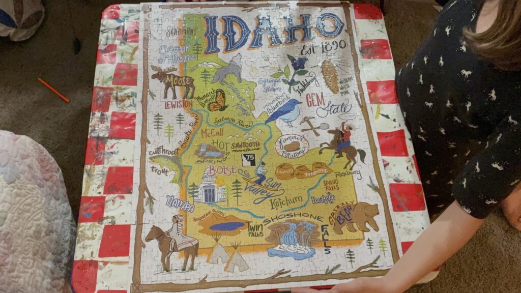 One of the kids got out a brand new 500 piece puzzle of Idaho that he found with the games and I helped him start putting it together. He got tired of the puzzle after a while but I became obsessed with it and spent the evening working on it until it was finished. The kids helped me at the end and were excited to put the last pieces in.