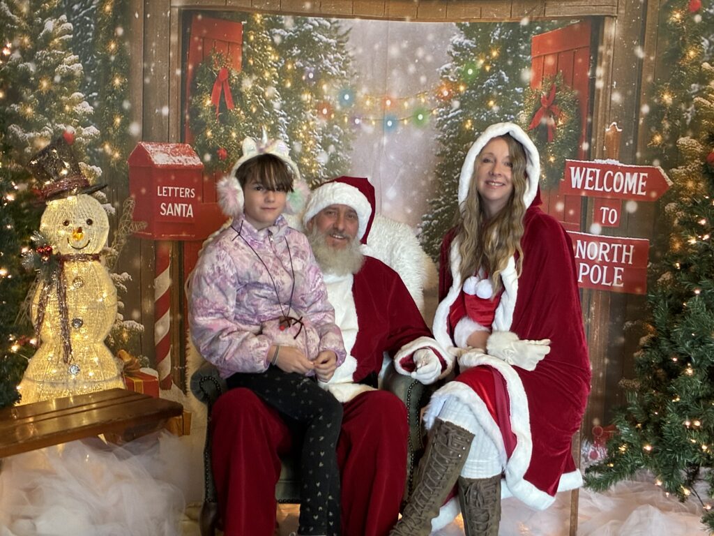 One of Angels friends stayed at the craft fair with his mom, while I took Angel and her other friend around town on the 4-wheeler. Several places in town had crafts for the kids to do or treats to give out. We went to the coffee shop and the girls made reindeer necklaces. Then we went by city hall where they had grinch cups with packets of hot cocoa. Then we went to M&W, where they said they didn’t know they were on the list and didn’t have a craft for the kids but the girls could get some hot chocolate out of the machine if they wanted and they did. Next we went to U of I extension office and the girls made globe Christmas ornaments. Then we went to the library and they colored little wooden tree ornaments. Next we went to the herb store and made little Christmas tree ornaments. Across the street at the gift shop, they had a craft in a bag for the kids to take to go. Then we went to “Santa’s house” and got pictures with Santa. Angel won’t tell me what she wants for Christmas but she told Santa. I got with Santa afterward and Angel said she wanted clay and slime for Christmas 🤷♀️. Our last 2 stops were Dollar General and the health clinic, where they had grab bags for the kids to take with them. I love that the town does this for the kids. It was so much fun.