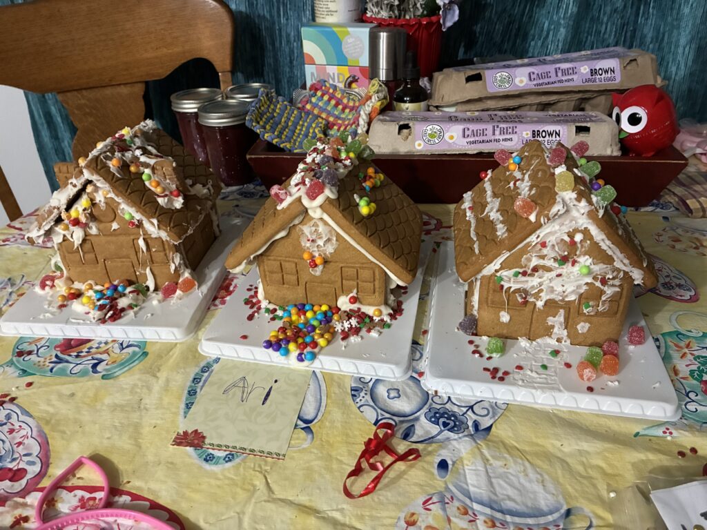 Angel had a couple of friends stay the night last night. When the kids woke up in the morning, I fed them breakfast, then we walked to the library to pick up gingerbread house kits to put together and enter into a contest. We brought the kits home and a big mess was made putting them together, but the kids had fun. I think they ate just as much frosting as they put on the houses, after I had already told them “no candy today”. When I caught them eating the frosting, they said that it wasn’t candy.. it was frosting. “Same difference”, I told them and gave them a stern look. They didn’t seem fazed 😂.