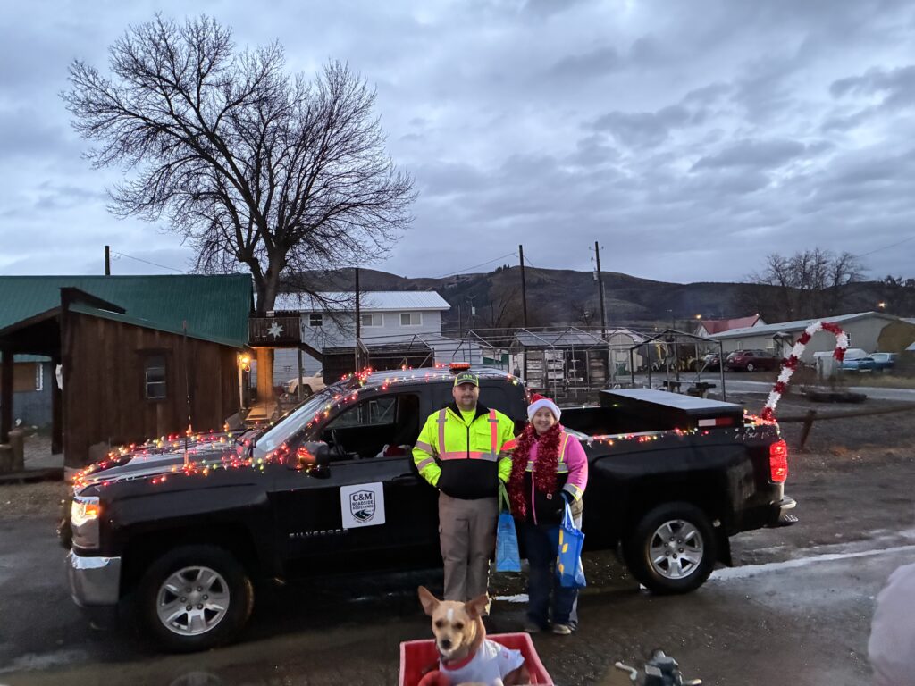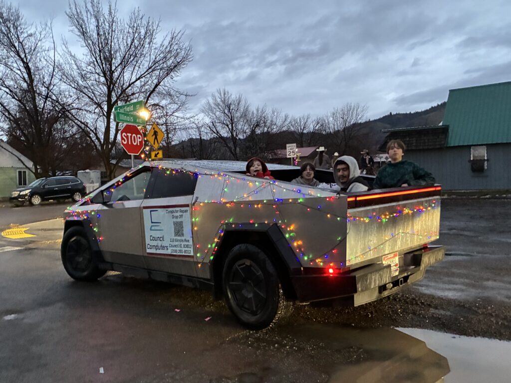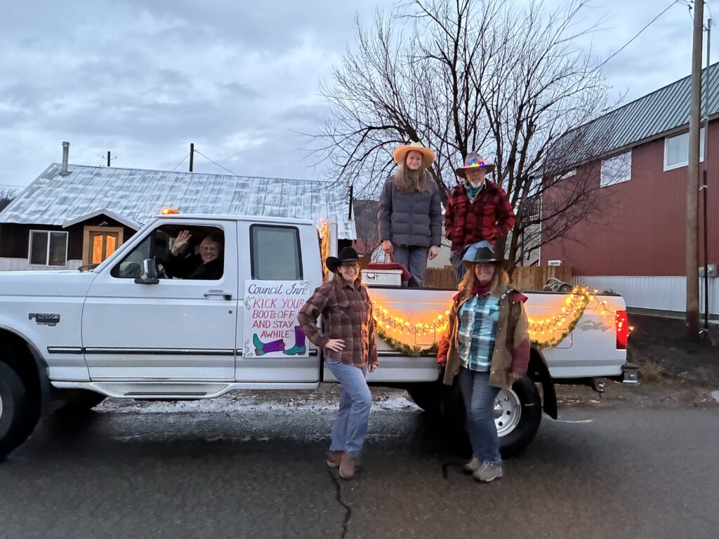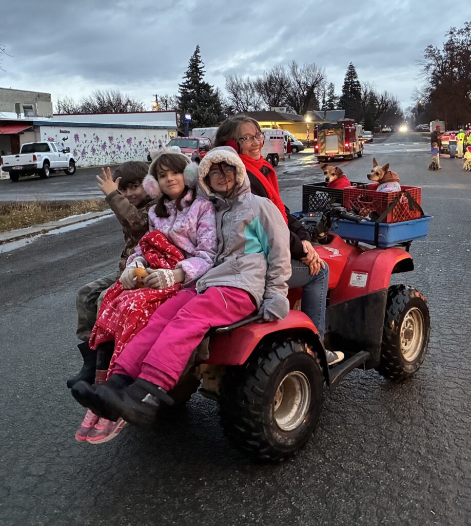 When I got to town, I quickly got ready to do the parade line-up. I put Christmas coats on the dogs and rode the 4-wheeler to the meeting spot which was changed to one block over…I found that out quickly 😂. The parade line up was controlled chaos but it all came together. Two of Angels friends came over to ride on the 4-wheeler with us. The parade started and we were off. It was fun riding in the parade. Next year I’ll be more prepared and add lights to the 4- wheeler.