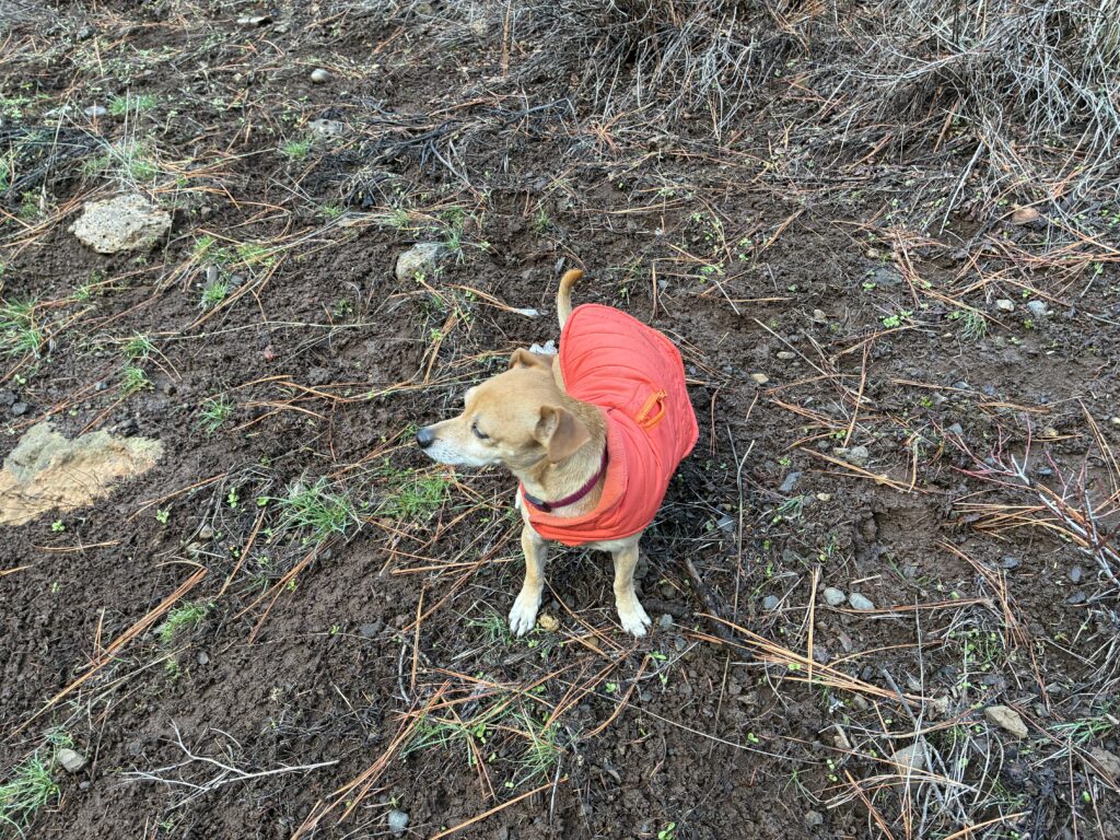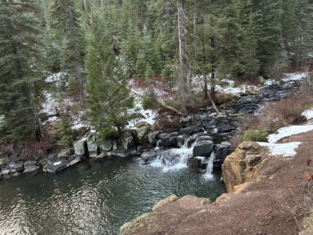 The roads were a little bit snowy in the higher elevations but they were still clear enough to easily drive on. When we got to Lost Creek Falls, I stopped to let the dogs run and walked down to look at the waterfall. When I got close to the edge, I slipped on the mud and almost slid off. That would have been a really cold plunge! I tried to stand back up but kept slipping in the mud, so I crawled to where there were patches of grass to stand up on. Note to self…don’t do that again!