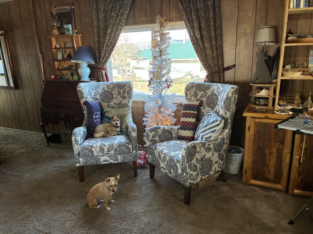 I drove to the thrift store where the accent chairs I had bought yesterday were sitting on the back deck waiting for me with my name on them. I brought them home, and Angel helped me set them up in front of the window with the Christmas tree in between. It looks really nice like that.