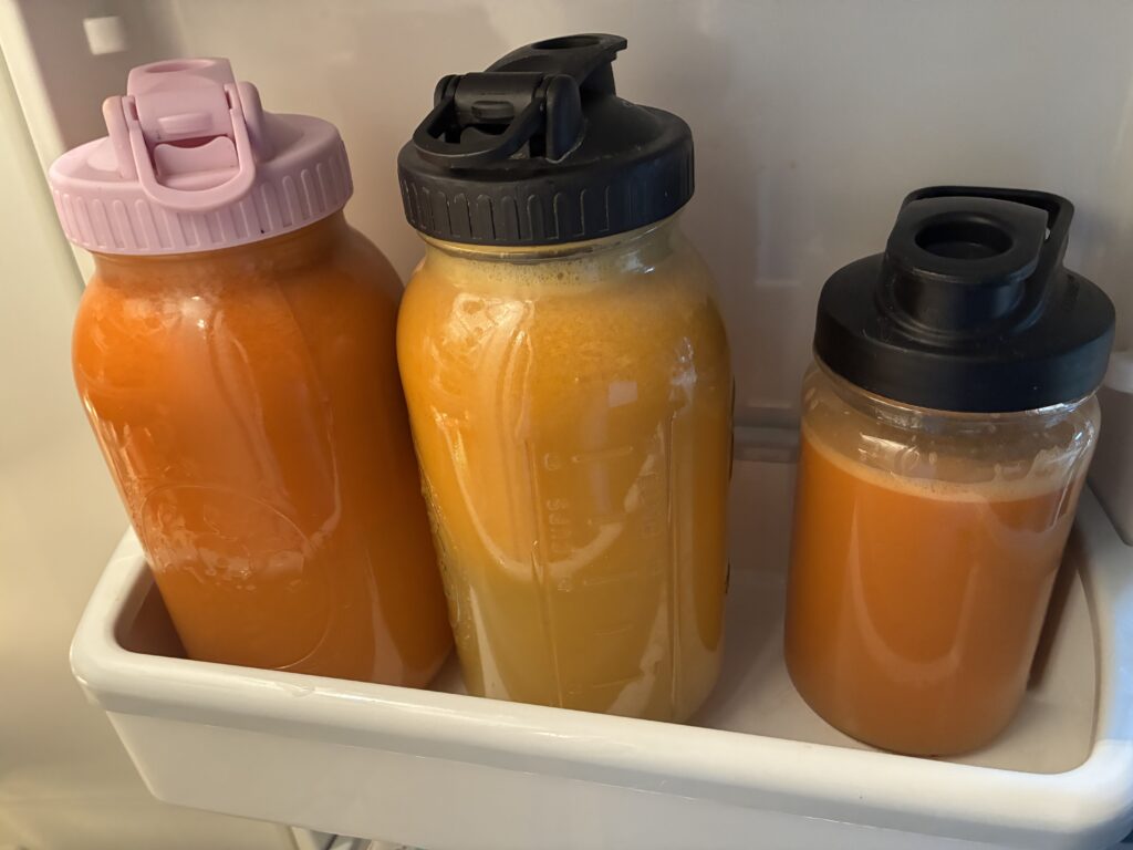 - 32 oz smoothie (3 bananas, almond milk, pear/apple juice, spirulina, cinnamon, turmeric, cacao and vitamin powder.